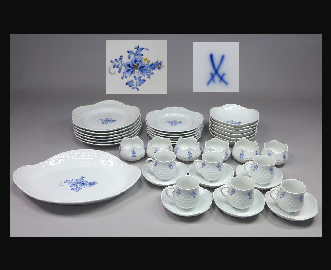 原文:●Meissen マイセン ホワイトレリーフ ブルーフラワー ティーセット7種37客 本物保証品!