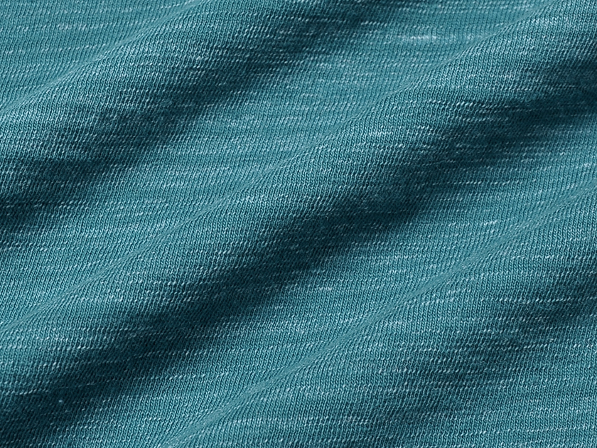 生地の種類は、 『伸縮性が高くソフトで滑らかな肌触りのメランジジャージー(天竺)』です。最高品質のコットン素材とポリエステルを原料にした細番手糸が使用された、軽やかな薄手のジャージー生地になります。キメが細かく、繊細で美しいジャージーは、伸縮性が非常に高く、一日中着ていてもストレスを感じません。 ¨ターコイズ基調のボーダー調霜降りメランジカラー¨の採用によって、絶妙なカジュアル感(こなれた風合い)が表現されていることもポイントです。