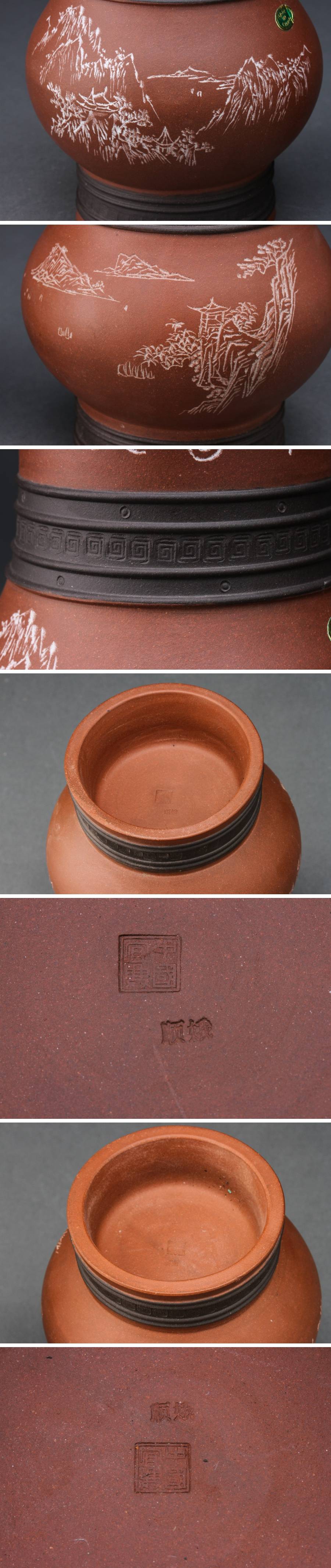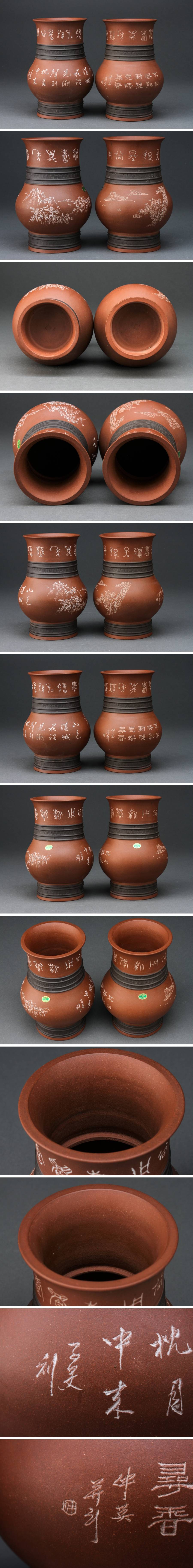 【SBCB】1969中国宜興在銘 紫砂漢詩風景文花瓶一対