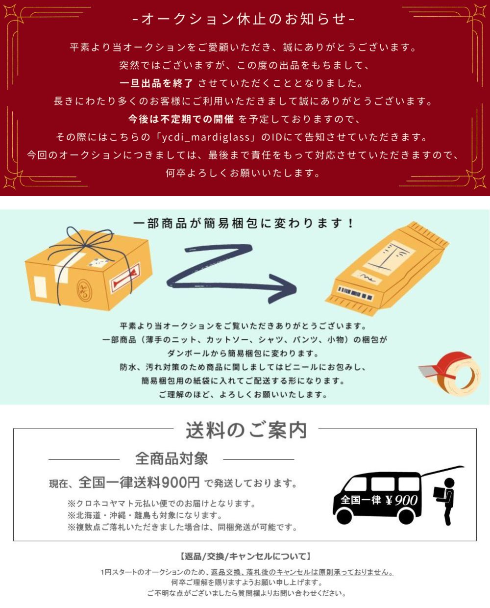 説明文・支払いについて等の事項をご確認・ご納得いただきましたうえでのご入札をお願いいたします。 営業時間外・定休日は連絡・発送・問い合わせ対応業務は行っておりません。 営業時間外のご質問への回答や入札の取り消し等はできかねます。 商品説明を十分にご確認の上、ご入札をお願い致します。 実物に近い画像の掲載を心がけておりますが、ご使用の端末・設定・環境により異なることがございます。 多少の色あいの違いは、ご了承ください。 休業日にいただいたご連絡、ご入金、お問い合わせは翌営業日より順次対応させていただきます。 そのためご連絡や発送が遅くなる場合がございますが予めご了承ください。 |