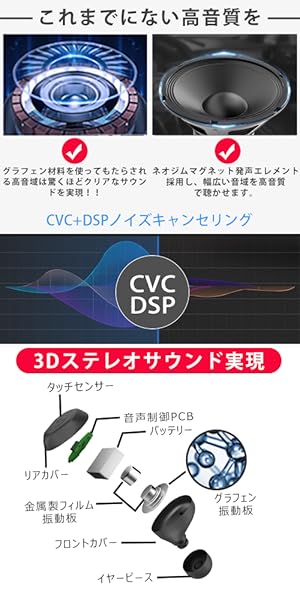 厳選した部品とデバッグ実行の繰り返し、パワフルなサウンドで高級イヤホンに負けなく、音も粒も感じれるほどクリアで、安定性&バランス感両立する高音質を楽しみいただけます。コーデックには高音質で遅延の少ないAACを採用し、音質の劣化や、音ズレが少なく、電波環境の悪い状況でも音の途切れを防止可能です。CVC8.0とDSPノイズキャンセリング技術を採用し、気軽に騒音をシャットアウトでき、しっかり騒音を低減してくれます。