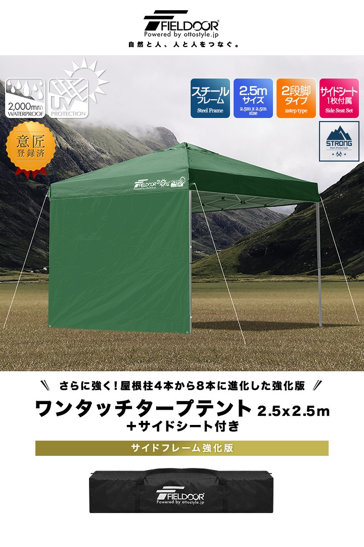 原文:【サイドフレーム強化版】FIELDOOR タープテント 2.5×2.5m 横幕1枚付 ワンタッチ タープ テント 組立て簡単/ スチール製 ブルー*即納