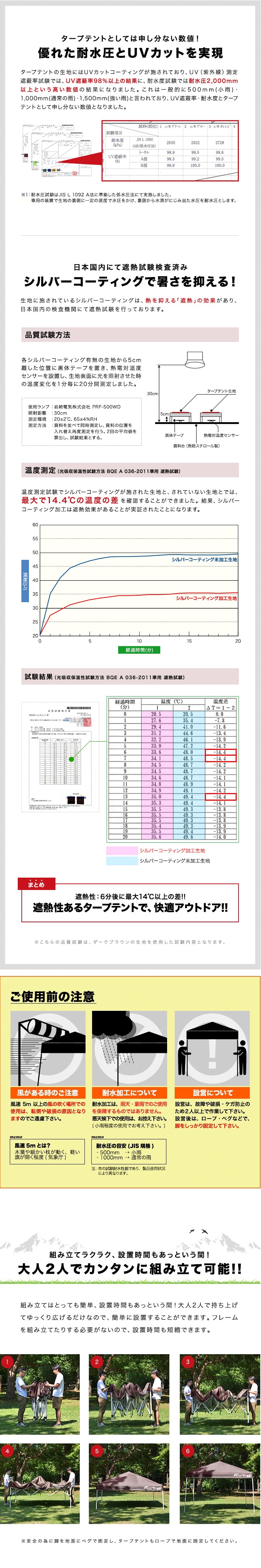 サイズ 組立時 : (約)2.5m×2.5m×1.65m / 2.37m / 2.45m 収納時 : (約)22cm×22cm×114cm 本体重量 (約)14.5kg 材質 フレーム : スチール 生地 : ポリエステル カラー ・ブルー 耐水圧 2,000mm以上 付属品 ・ロープ ・ペグ ・専用収納ケース ・取扱説明書(日本語・英語) 使用上のご注意 【生地の色味について】 生産時期により購入されたシートとテント本体の色味が若干異なっている場合があります。 申し訳ありませんが、ご了承の上ご購入をよろしくお願いいたします。 【荒天時使用について】 本テントは耐水加工が施されておりますが、雨天時や風が強い荒天時にはペグで地面に固定しても 突風や瞬間的な豪雨などでテントが破損する場合がございますので、使用されませんようお願いします。 風・雨などの自然現象による破損につきましては保証の対象外となりますのでご注意ください。 【設置について】 テントから長時間離れる場合は必ず収納して下さい。 使用者がいない状態で設置されていた場合、急な突風や豪雨等の自然現象、 想定外の事故等によりテントの破損や周囲への過失に繋がる可能性があります。 大変危険ですので必ず使用者が目視できる状態で設置ください。 |