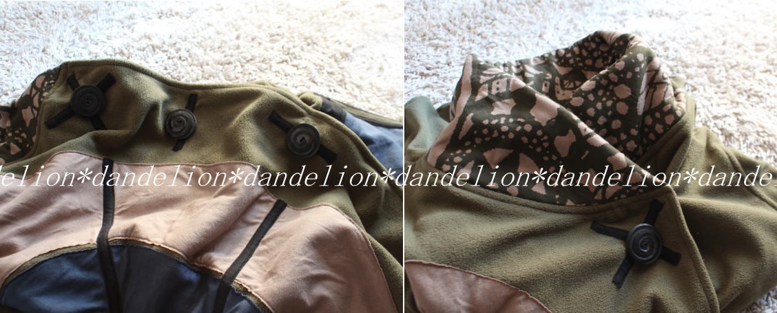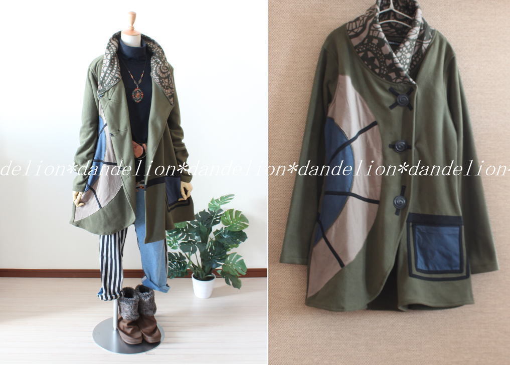 原文:裏地起毛*フリース素材*サークル模様切替×サークルモチーフパッチワーク*中綿ハイネックジャケットコート*ユニセックス*カーキ*M