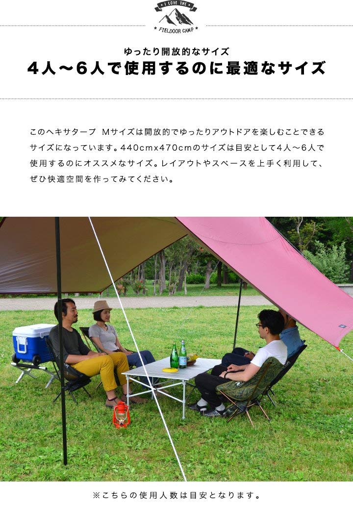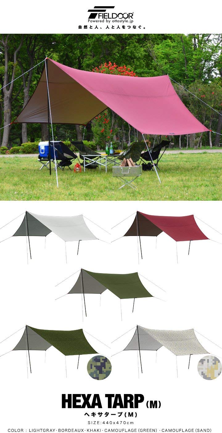 原文:【FIELDOOR】ヘキサタープ 440x470cm Mサイズ 【カモフラグリーン 6人用】 タープ テント 日よけ キャンプ BBQ UVカット 高耐水加工*即納
