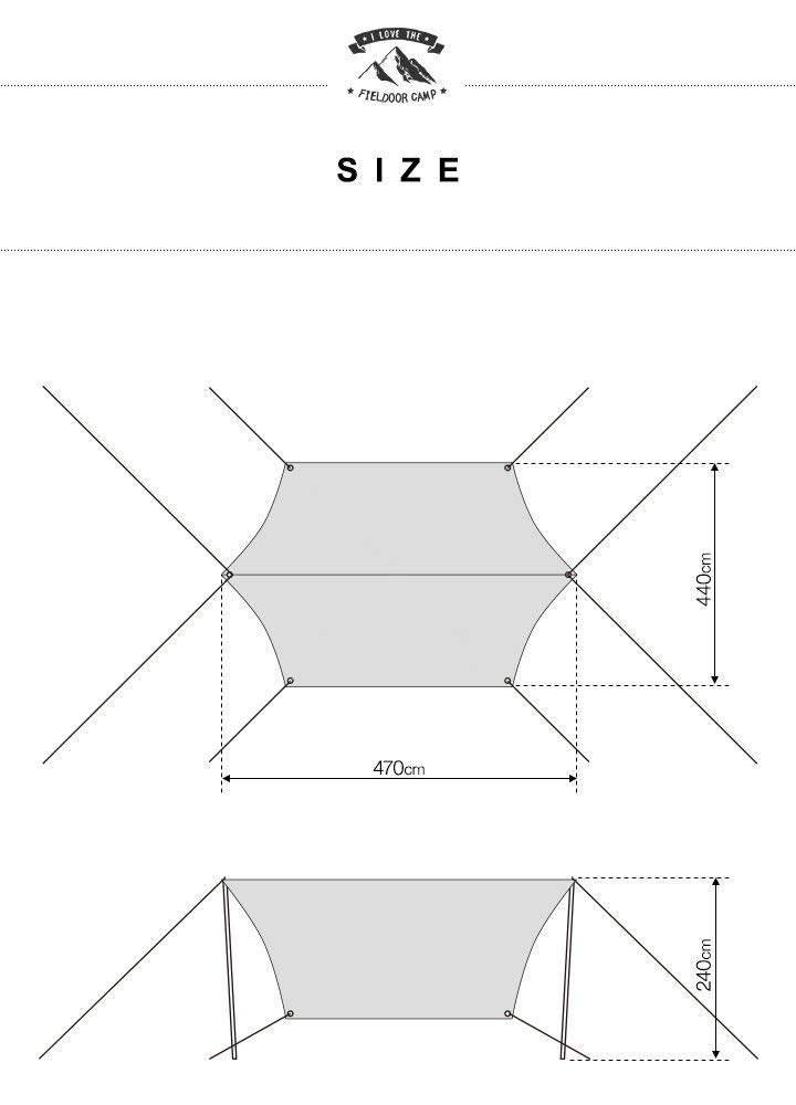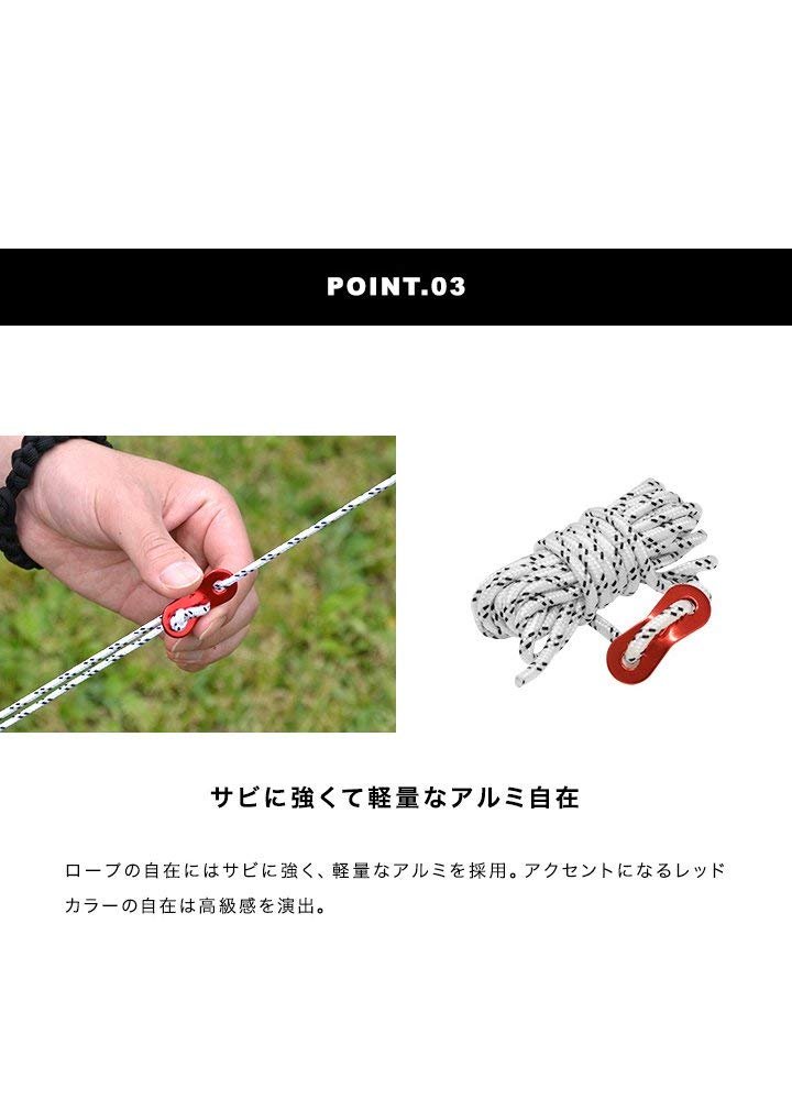 | 素材・材質 | タープ:ポリエステル150D(PU2000mm) ポール:アルミニウム合金(表面加工:アルマイト加工)Φ22mm×220cm |