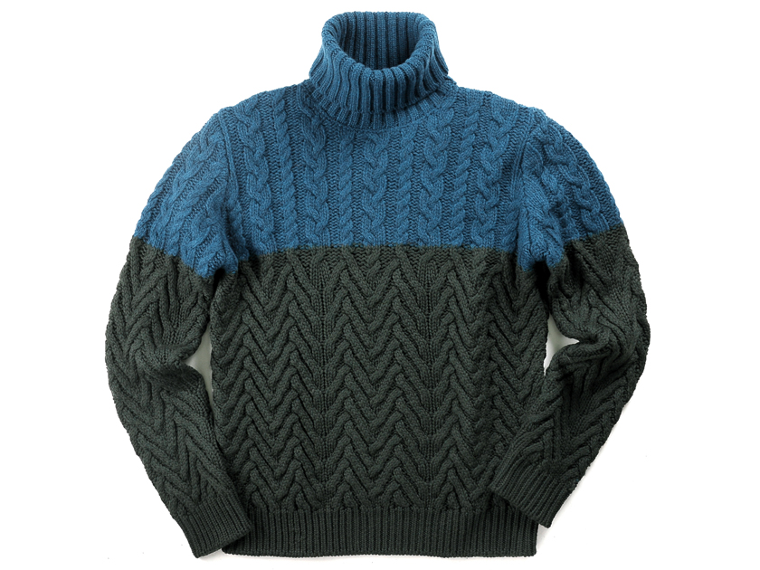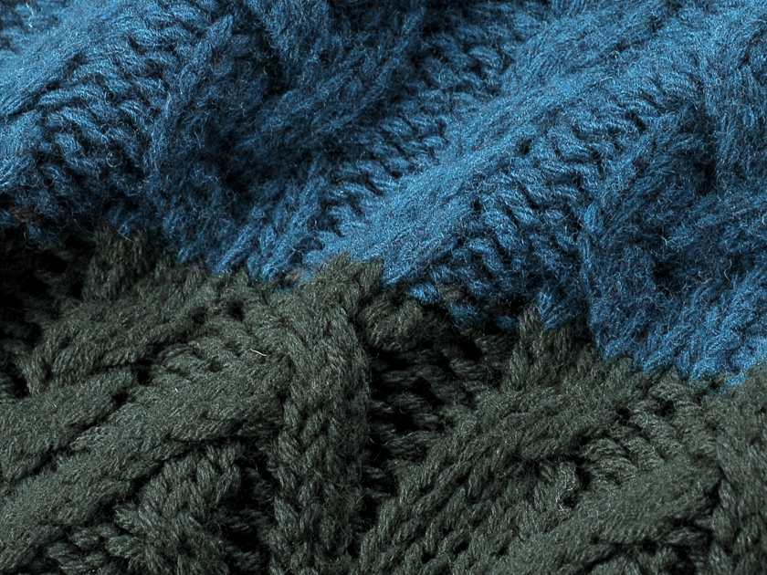 エクストラファインメリノウール100% Fabric / 生地 ざっくりしていてボリューム感のあるローゲージニット(ケーブル編み) Season / シーズン 秋冬 Color / 色 ブルー×オリーブ Size / サイズ