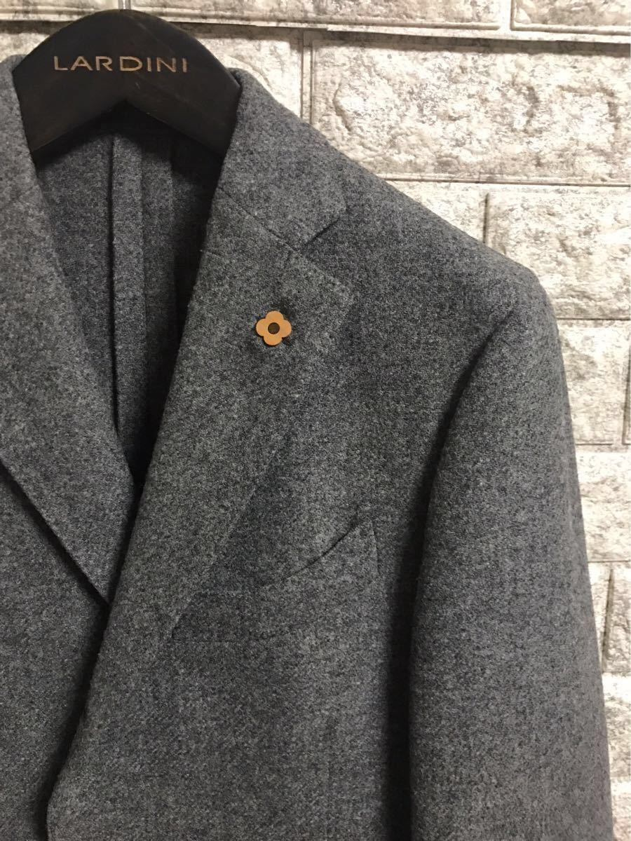 ブートニエールは木製で珍しいです。肉厚でしっかりした一着です。