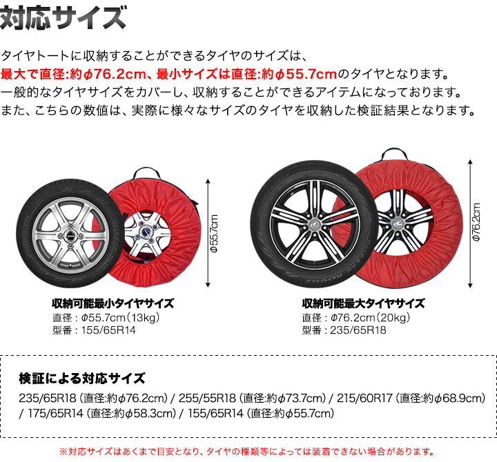 | 適合タイヤ | 直径 : (約)Φ55.7cm~(約)Φ76.2cmまで ※タイヤ幅最大 : 25.5cmまで |