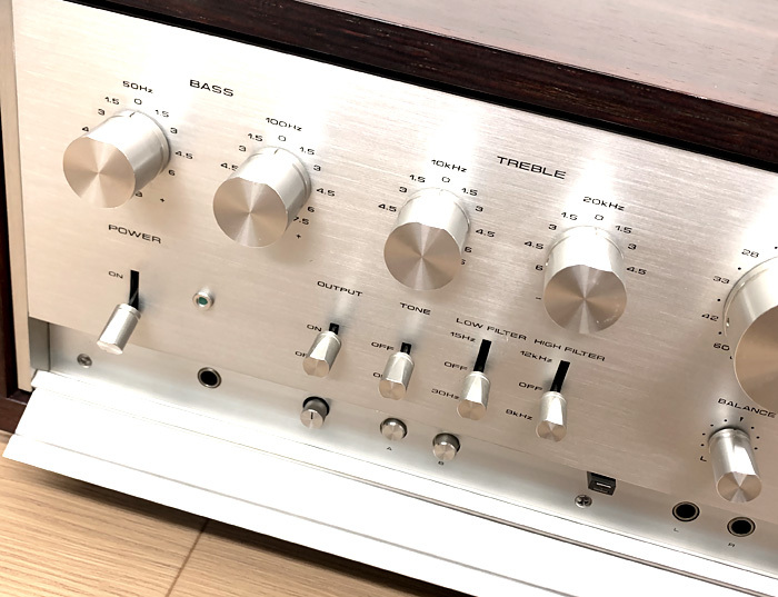 ・周波数特性: balanced input (CD、Line) → 1.0Hz~350kHz +0 -3.0dB 20Hz~20kHz +0 -0.2dB CD、Tuner、Line、Tape Play → 1.0Hz~350kHz +0 -3.0dB 20Hz~20kHz +0 -0.2dB AD →20Hz?20kHz、+0 -0.2dB ・全高調波歪率:0.005% (全ての入力端子にて) ・入力感度/インピーダンス (定格出力/0.5V出力時): AD MM → 2.0mV/0.5mV/47kΩ AD MC (26dB) → 0.1mV/0.025mV/10Ω、30Ω、100Ω AD MC (32dB) → 0.05mV/0.0125mV/10Ω、30Ω、 100Ω Balanced → 252mV/63mV/40kΩ(20kΩ/20kΩ) Unbalanced → 252mV/63mV/20kΩ ・定格出力/インピーダンス: Balanced output → 2.0V/10Ω(5Ω/5Ω) Unbalanced output → 2.0V/5Ω Tape rec → 252mV/200Ω ・S/N/入力換算雑音 (入力ショート、A-補正): AD MM → 90dB AD MC (26dB) → 80dB AD MC (32dB) → 75dB Balanced/Unbalanced → 111dB ・最大出力レベル(歪率 0.005%、1kHz): Balanced output → 7.0V Unbalanced output → 7.0V Tape rec → 19.0V ・電源電圧:AC100V、50Hz/60Hz ・消費電力:53W ・本体サイズ:468 × 171 × 415mm (幅×高さ×奥行) ・本体重量:25.2kg