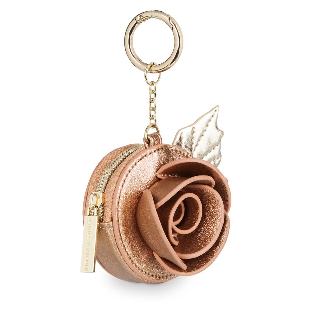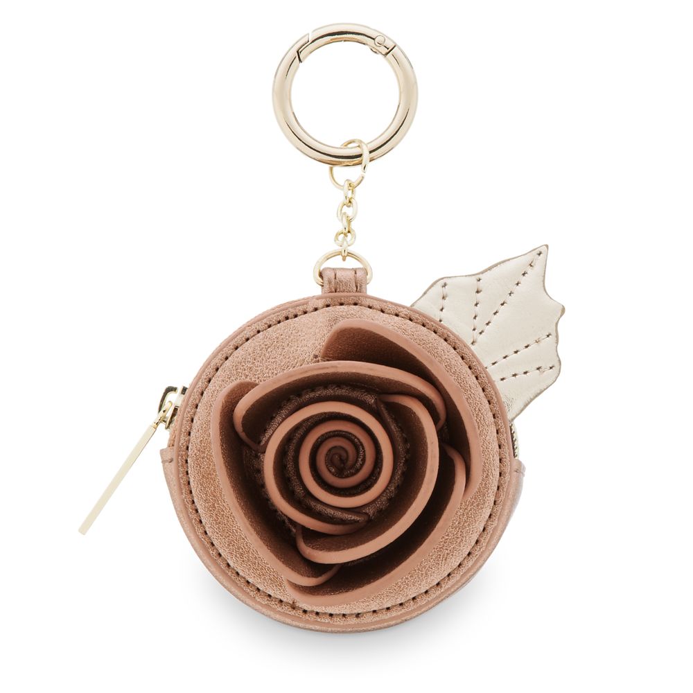 Magic in the details... Dimensional light pink faux leather design with 3D rose petals and leafGold metallic faux leather leaf accentsZip closureGoldtone hardwareAttached metal key ringInterior features Danielle Nicole print liningPart of the Danielle Nicole Disney Collection
