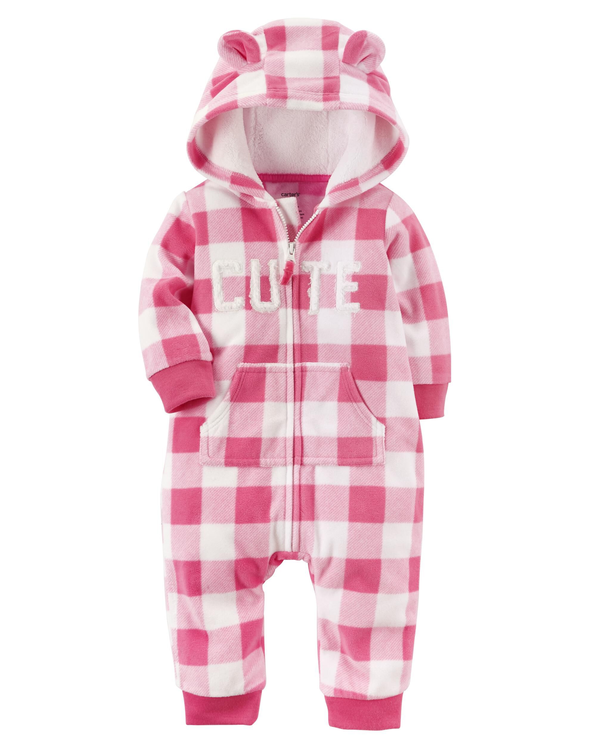 This hooded jumpsuit makes dressing quick and easy. Keep her cute and cozy for the chilly weather! Style # V_118H394 Zips from ankle to chinWorry-free safety tabAppliqué "CUTE" sloganRibbed cuffs3D ears on fuzzy-lined hood