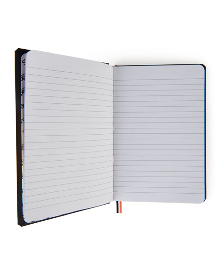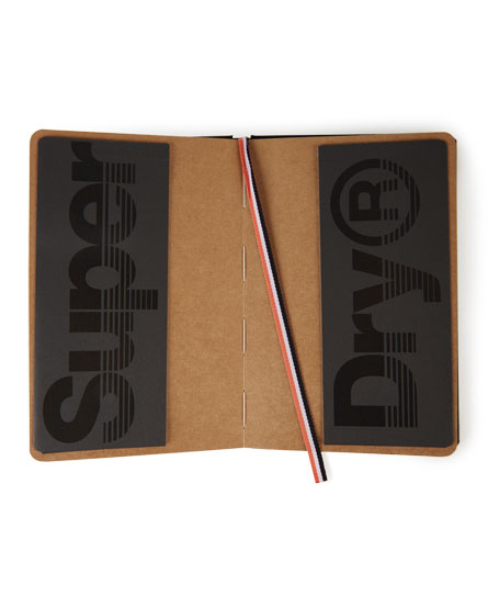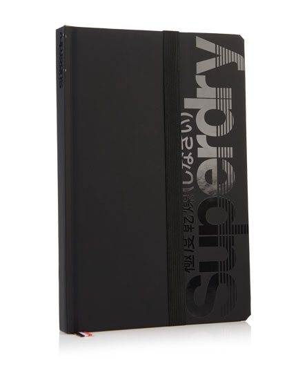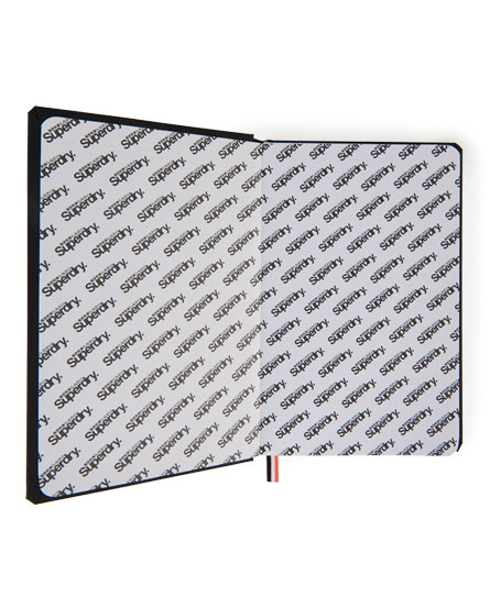 Superdry Editors notebook. This A5 notebook comes with 100gsm white leaf paper with neon page ruling. The hard back notebook features a soft touch cover shell, branded centre pockets and has a printed Superdry logo on the front and spine. The Editors notebook is finished with a tri colour ribbon and an elasticated strap used to secure the notebook when not in use.