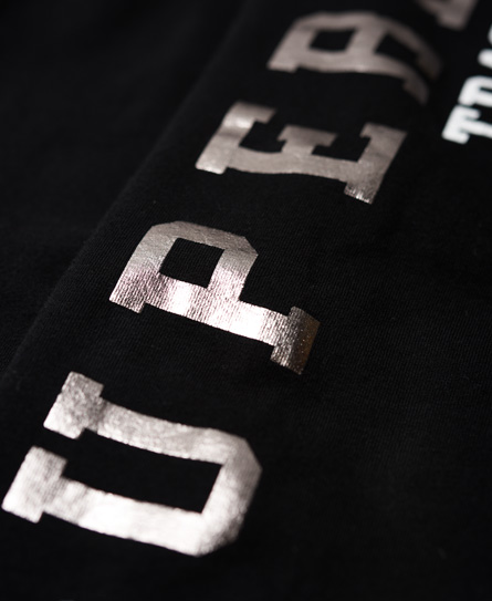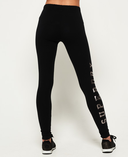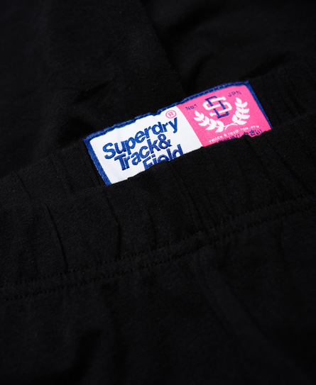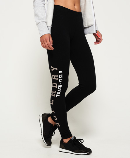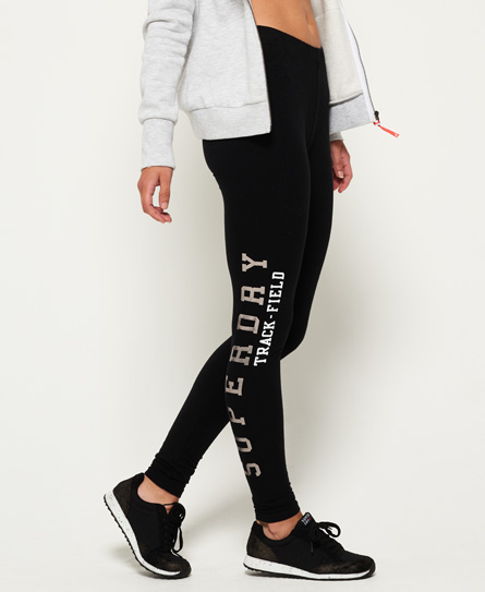 Superdry women’s Trackster leggings. A pair of soft cotton leggings that come with a large Superdry Track & Field logo in a foil and cracked print effect along one leg. The leggings are finished with an elasticated waist.