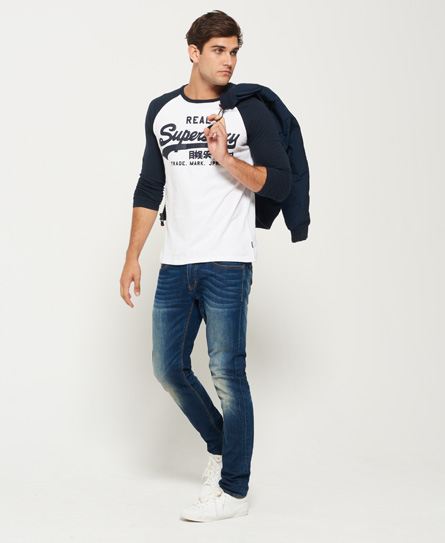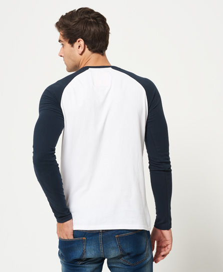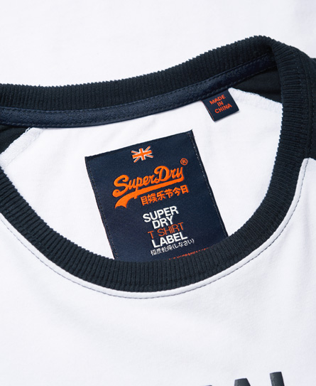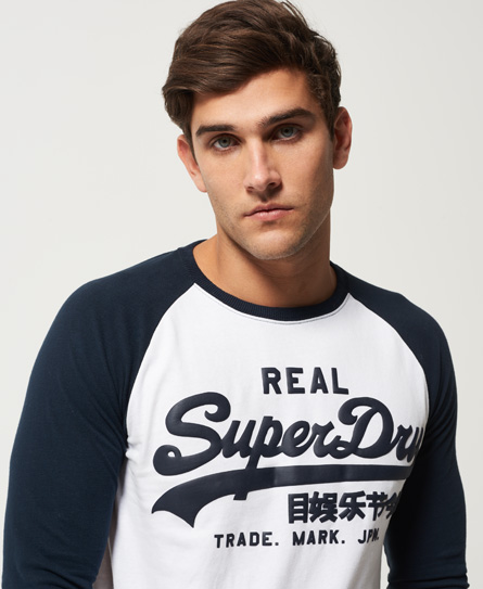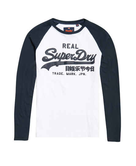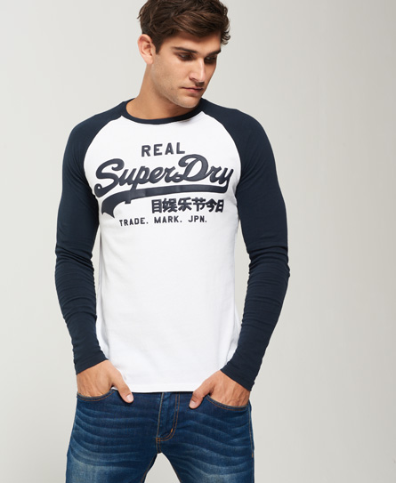Superdry men's Vintage Logo Raglan long sleeve t-shirt. A crew neck long sleeved t-shirt featuring contrast colour Raglan sleeves and a raised Vintage Superdry logo on the chest. The t-shirt is finished with a duo colour tab on the side seam. Model wears: Medium Model height: 6’ 2” (188cm) Model chest size: 37" (93cm)Small to size
