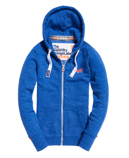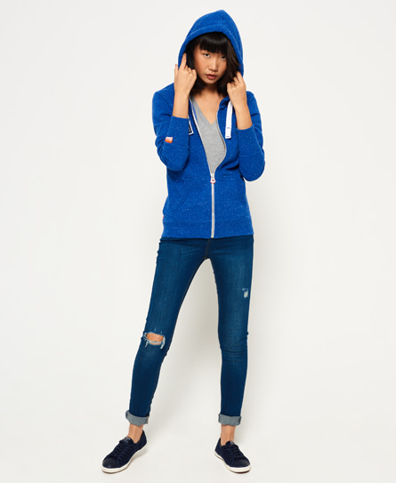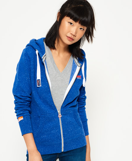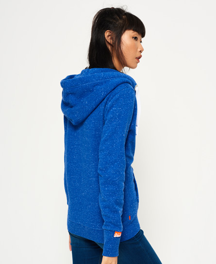 Superdry women's Primary zip hoodie from the Orange Label range. A classic zip through hoodie featuring a drawstring hood, two front pockets and an embroidered Superdry chest logo. The hoodie is finished with a Vintage Superdry logo tab on the cuff and a signature orange stitch in the side seam. Model wears: Small Model height: 5’ 10” (175cm) Model chest size: 32" (81cm)