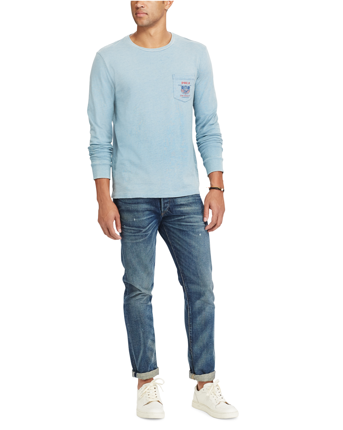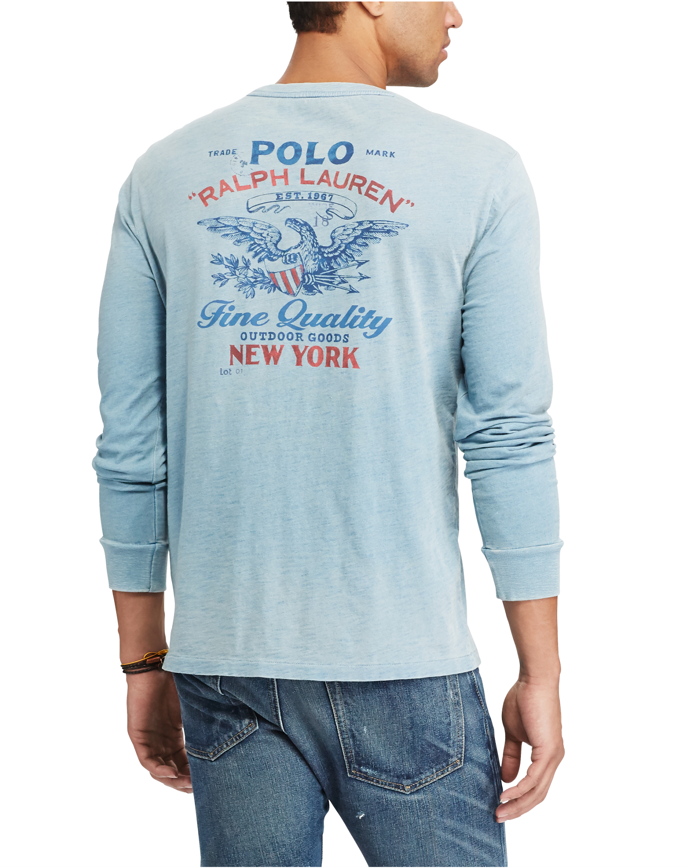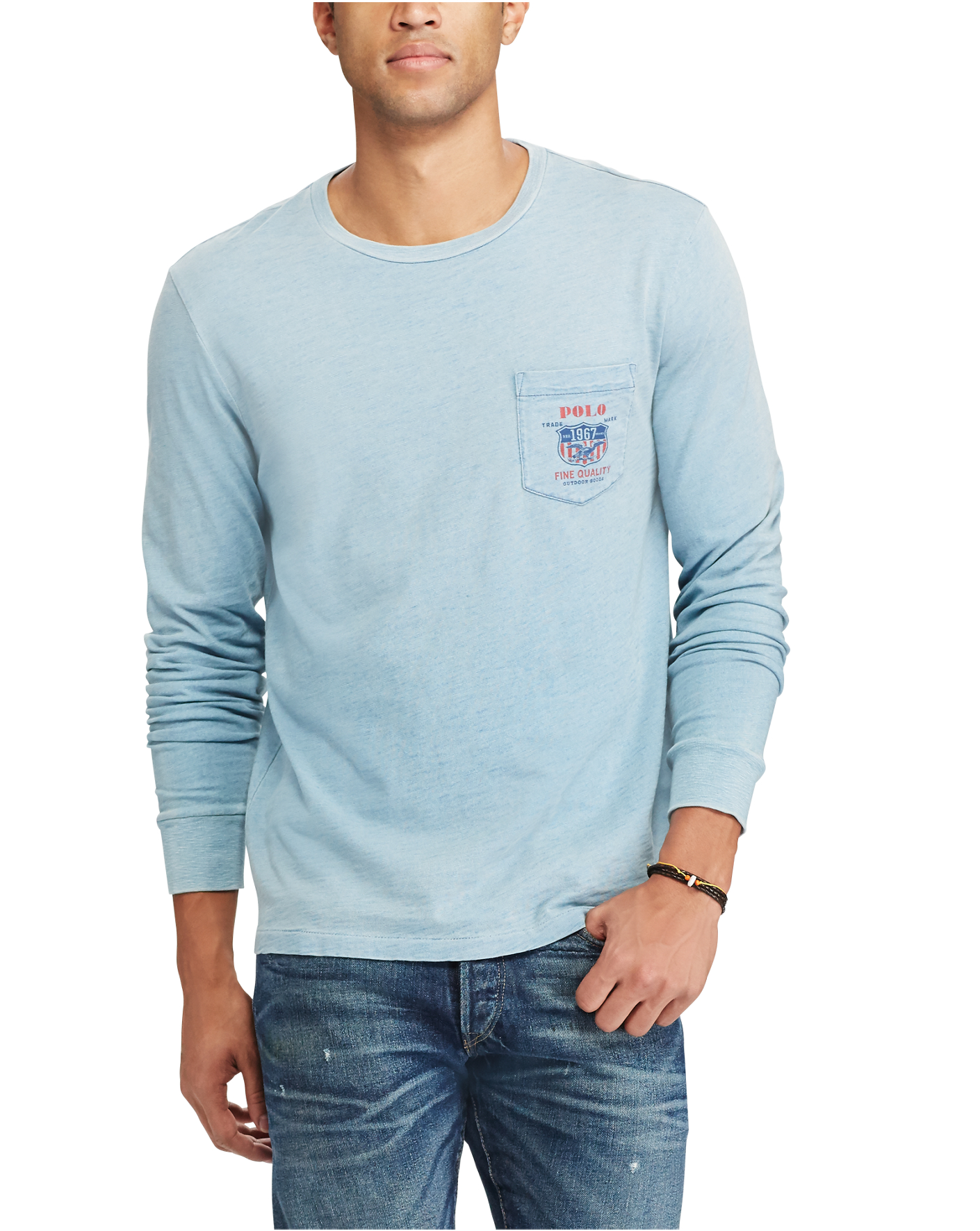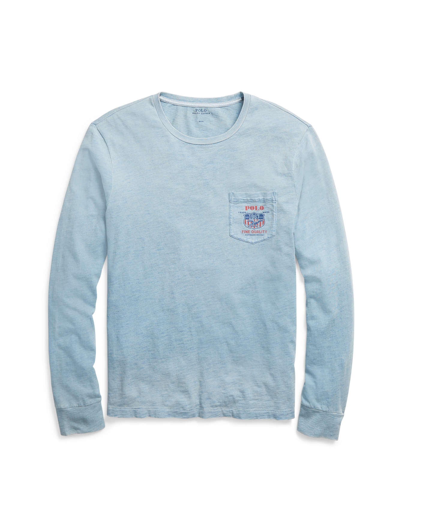Details Custom Slim Fit: our trimmest silhouette. Previously called Custom Fit. Our T-shirts also come in Classic Fit (our roomiest). Size medium has a 27½" body length and a 34½" sleeve length. Sleeve length is taken from the center back of the neck. Crewneck. Long sleeves with ribbed cuffs. Left chest patch pocket. "Polo Trademark Fine Quality Outdoor Goods" and a shield printed at the chest pocket. "Polo Ralph Lauren Trademark Est. 1967 Fine Quality Outdoor Goods New York" and an eagle printed at the center back. 100% cotton. Machine washable. Imported. Dyed with indigo, which may rub off onto fabrics, leather, and upholstery. Model is 6'1"/185 cm and wears a size medium.