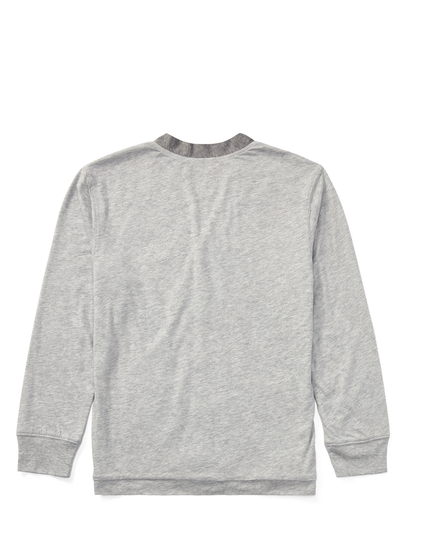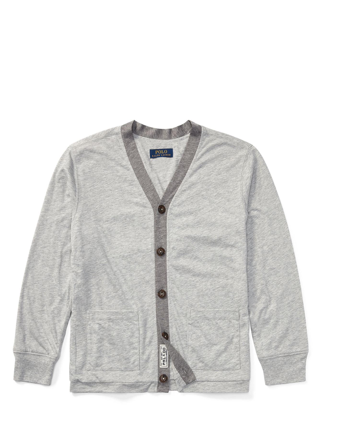 Details 60% cotton, 40% polyester. Machine washable. Size medium has a 23½" body length and a 28½" sleeve length. Sleeve length is taken from the center back of the neck. Contrasting V-neck. Contrasting buttoned placket. Woven "PRL & Co Ralph Lauren" patch at the placket facing. Long sleeves with contrasting ribbed cuffs. Two front waist patch pockets. Imported.