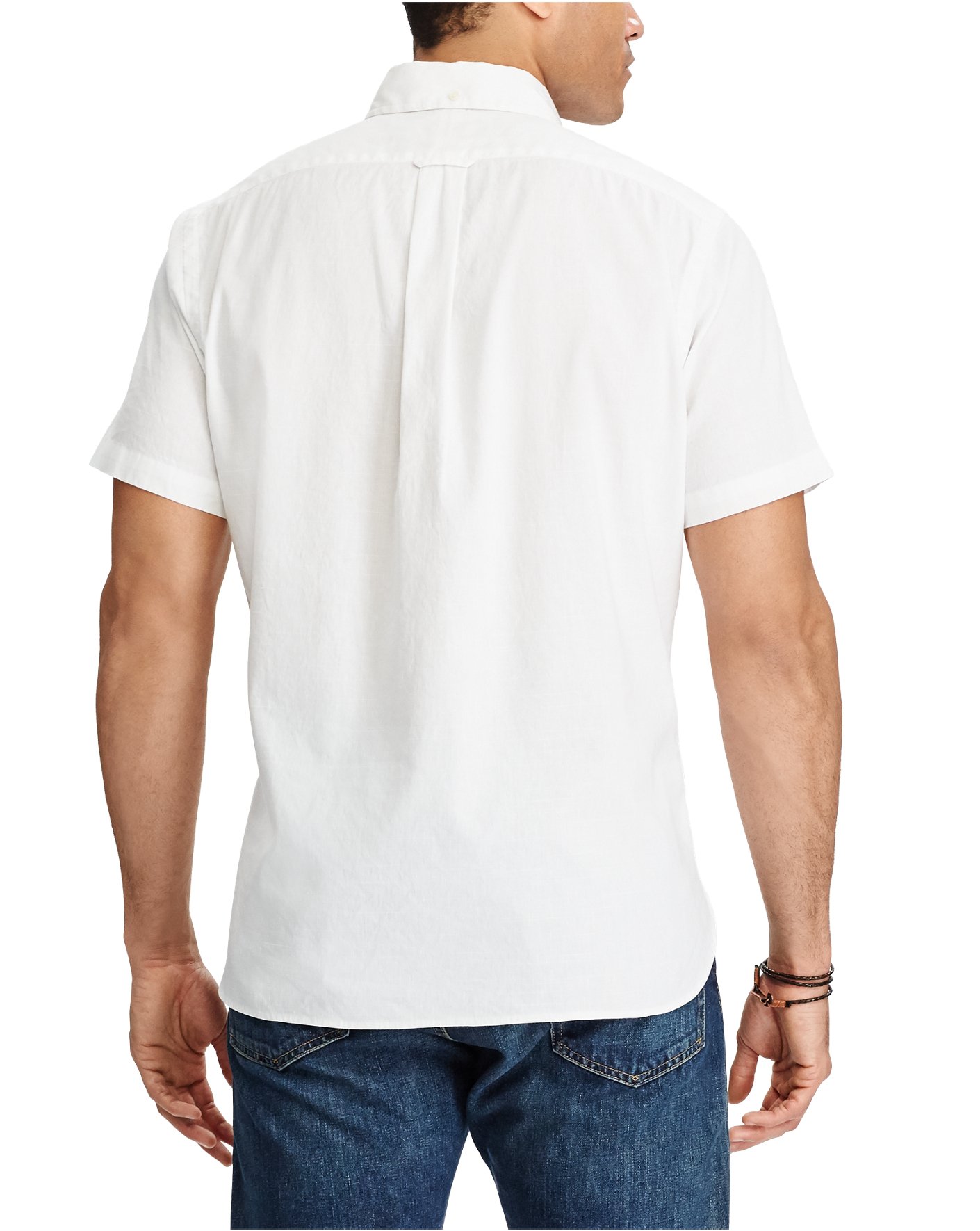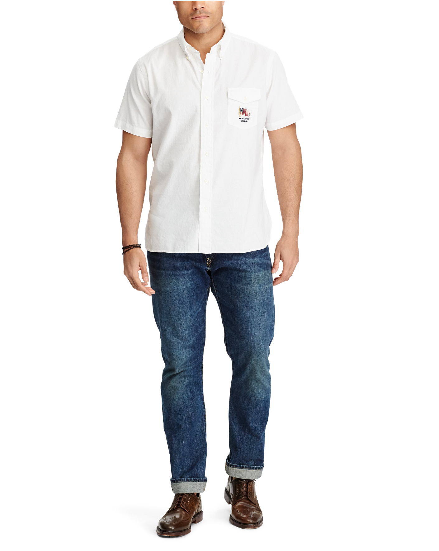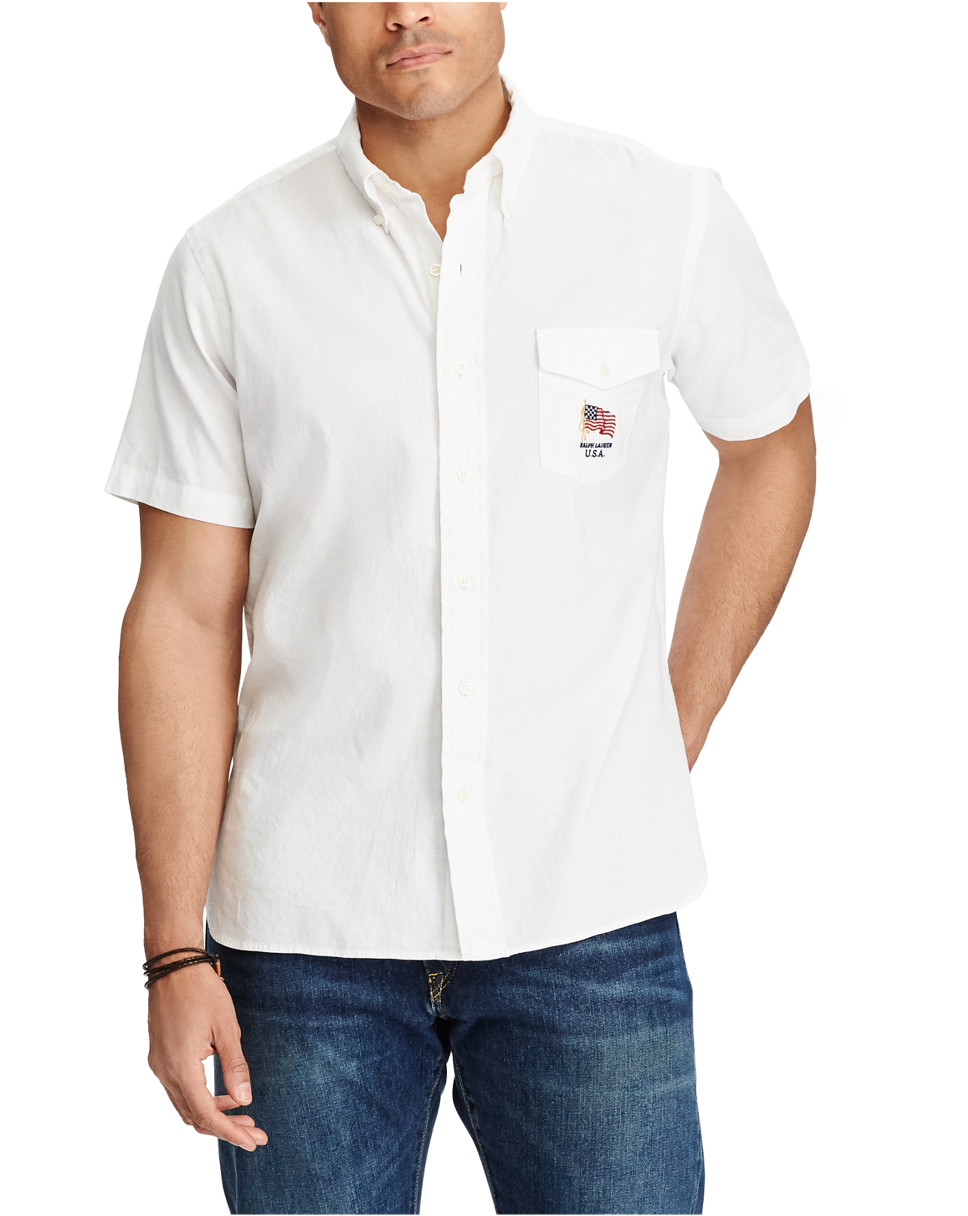 Details Classic Fit: a comfortable, relaxed silhouette. Size Big 2X has a 33" body length. Size Tall 2L has a 36" body length. Button-down point collar. Buttoned placket. Short sleeves. Left chest buttoned pocket. "Ralph Lauren U.S.A." and a historical American flag embroidered at the pocket. Split back yoke with a box pleat ensures a comfortable fit and a greater range of motion. 59% linen, 41% cotton. Machine washable. Imported.