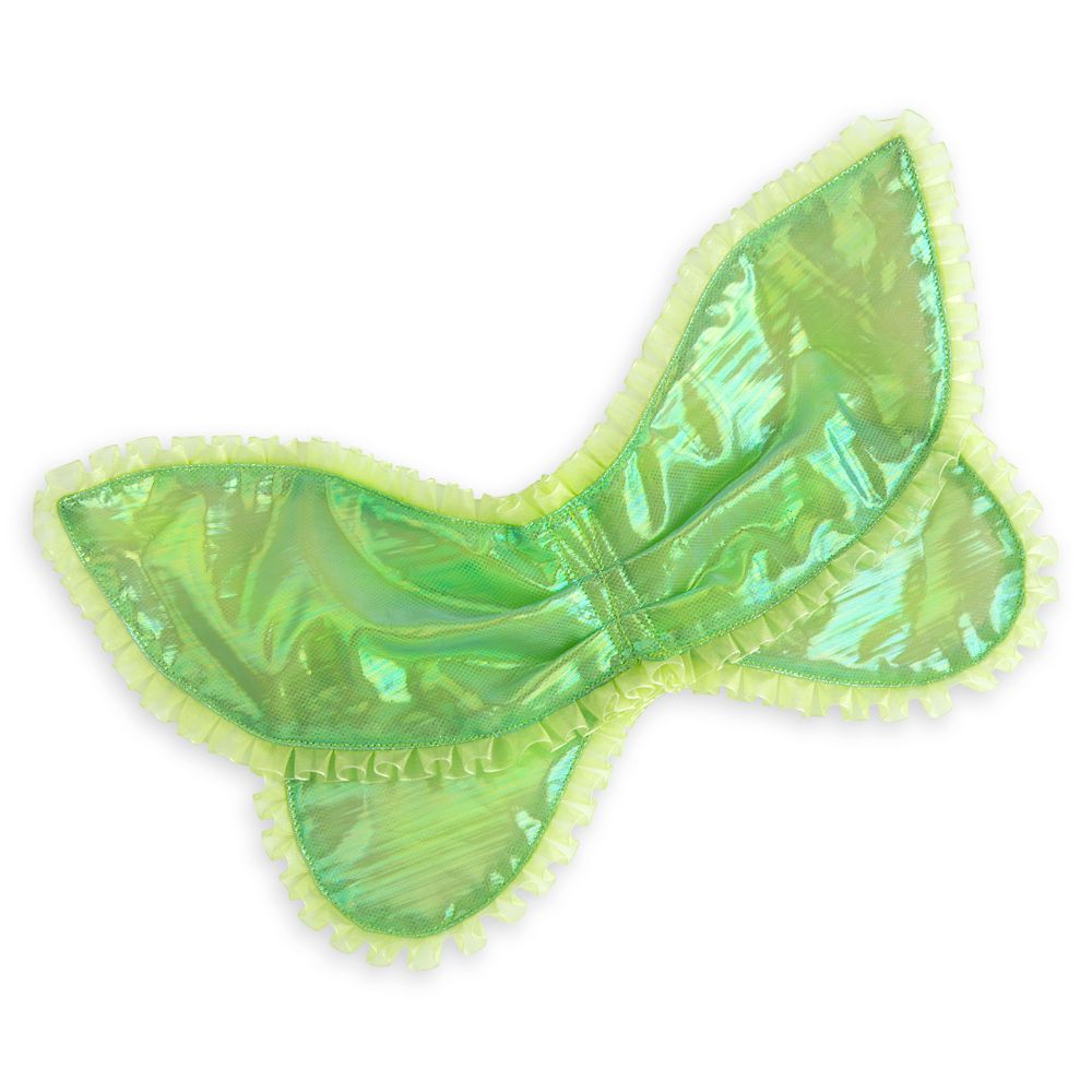 Magic in the details... Authentic Disney CostumeIncludes detachable iridescent wings with ruffled organza trim and self-stick fabric attachmentBodice features shimmering metallic specsLayered organza wing sleevesSelf-stick fabric back closuresSatin underskirtPleated tulle mid-layerOrganza petal overskirt with metallic foil filigreeIridescent contrast trims and beltSatin ribbon florette appliqué with bow at waistGlittering Tinker Bell cameo brooch accented by jewelsStretch back and bodysuit panty with leg snaps