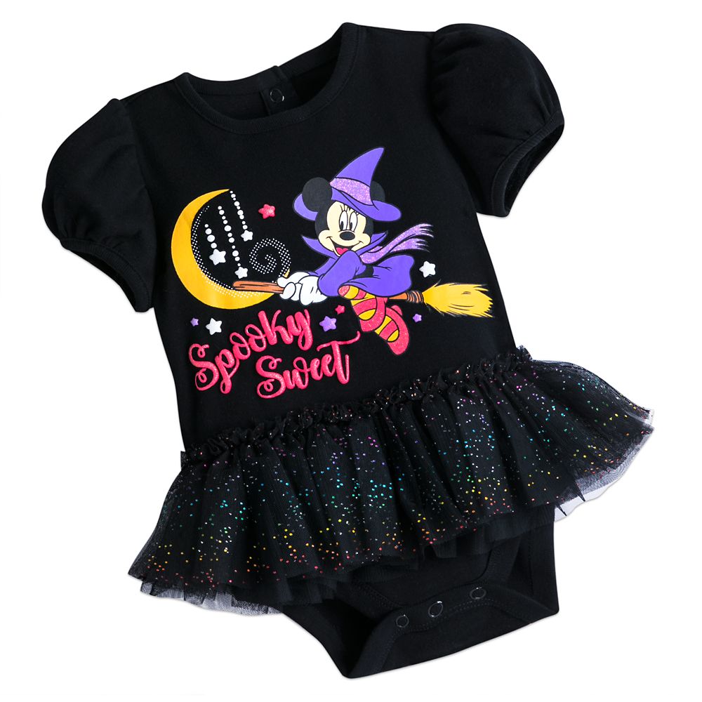 Magic in the details... Screen art of Minnie dressed as witch on a broomGlitter finish accentsPuff paint stars and text that reads: ''Spooky Sweet''Puff sleeves with elastic cuffs Attached ruffle tutu skirt with sequinsRibbed collar and cuffs Three-snap placket at back Inseam snaps