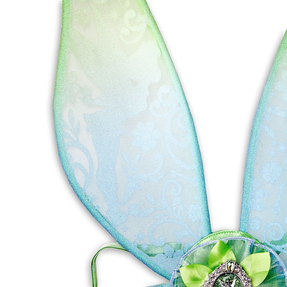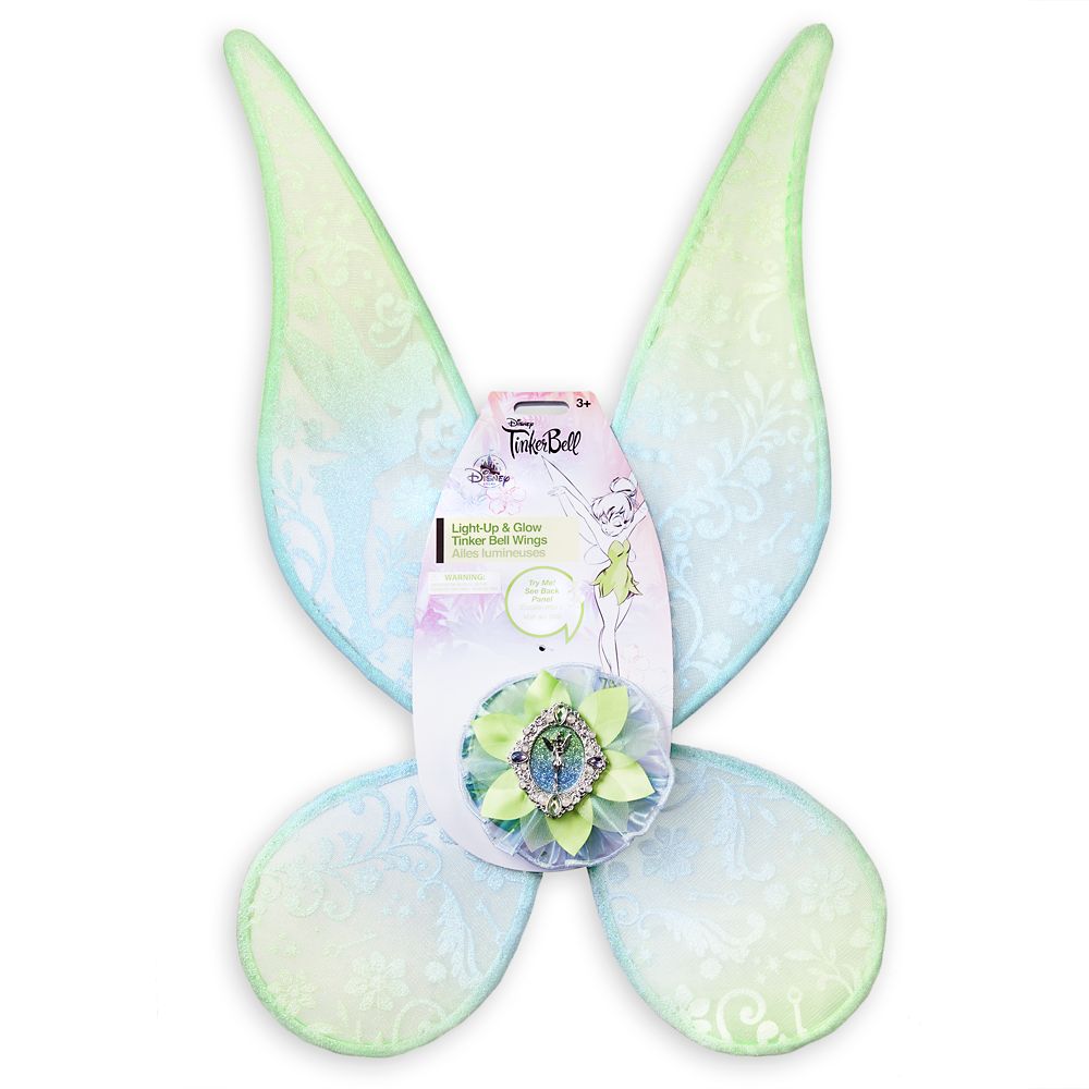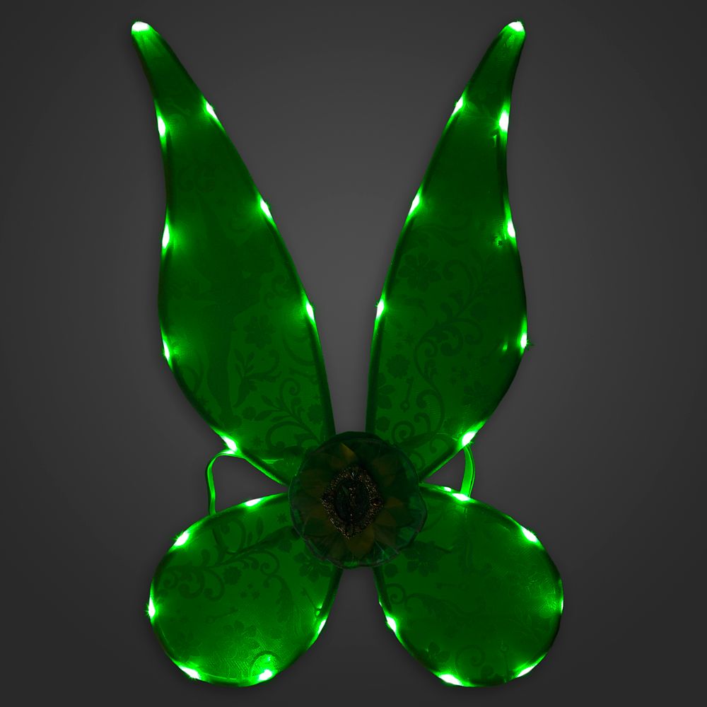 Magic in the details... Press button to light-up wings in sparkling patternSheer fabric fairy wings on wire frameGlow in the dark glittering filigree with Tinker Bell silhouetteCenterpiece features a sparkling Tinker Bell cameo charm with gems and fabric petal trimsAdjustable arm bands hold wings in placePart of our Tinker Bell Costume Collection for Kids