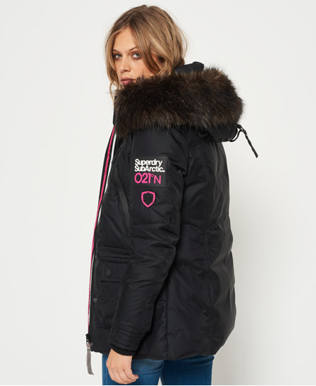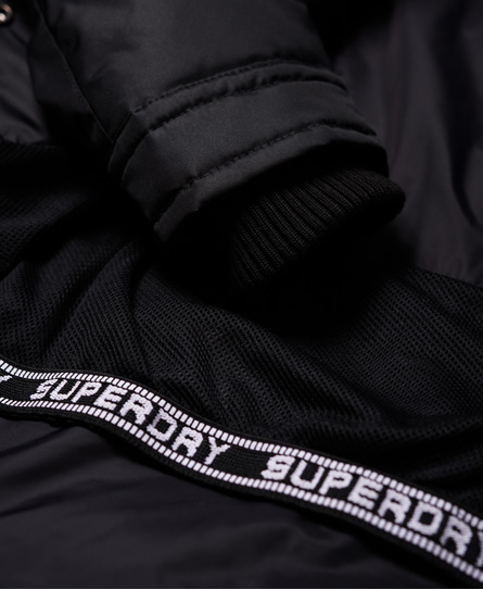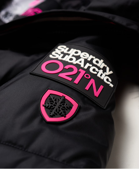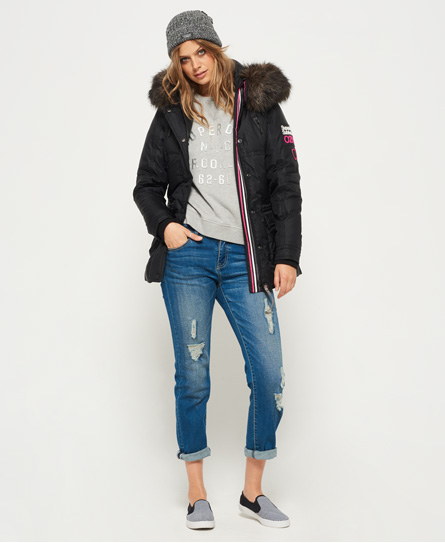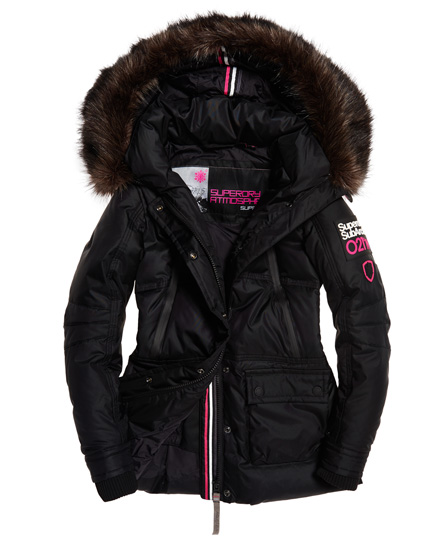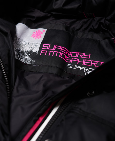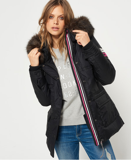The Full Tech range from the Superdry Snow collection is designed for max performance with technical fabrics and high water resistance. This range is for skiers & boarders taking on advanced slopes and black runs. Superdry women’s Canadian Down Ski Parka Jacket. This padded snow proof jacket complete with a padded collar and detachable fur trim hood. This jacket features a zip and popper fastening, four front pockets, one inside pocket and two zips underneath each pockets with a breathable mesh lining. Inside the Canadian down jacket there is a removable snow skirt and snow cuffs to help keep out the cold and keep in the warm. The jacket is finished with Superdry branding on the sleeve.