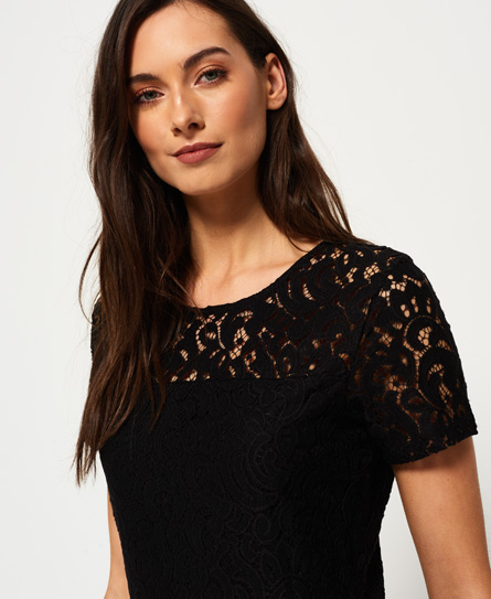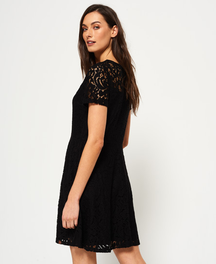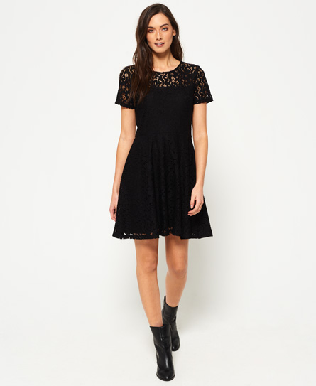Superdry women’s lace fit and flare knit dress. This delicate lace fit and flare dress is the must have this season and features an all over lace design and short sleeves. The dress is finished with a side zip fastening and a Superdry logo tab on the hem. Model wears: Small Model height: 5’9” (175cm) Model chest size: 32" (82cm)