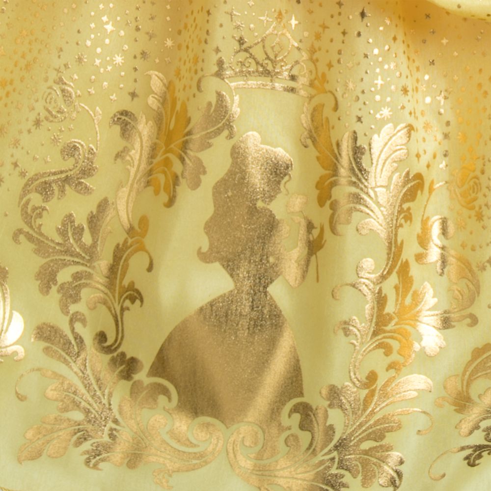 Magic in the details... Authentic Disney Princess CostumeVelour bodice with glittering diamond patternInset v-panel edged in gold and red brocade Jeweled enchanted rose brooch with glitterPleated organza necklineVelour puff sleeves with glittering diamond pattern and pleated gold organza cuffsOrnate gold trim at waistlineStretch fabric at back for comfy fitSatin peplum with bubble upper section with scalloped hem and ruched detailingGold foil storytelling screen art with red satin rose appliquésFull acetate underskirt with layered tullePart of our Belle Costume Collection for Kids