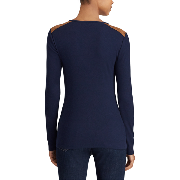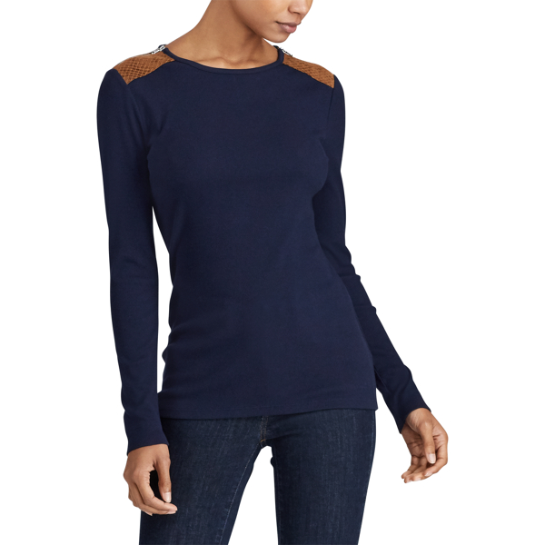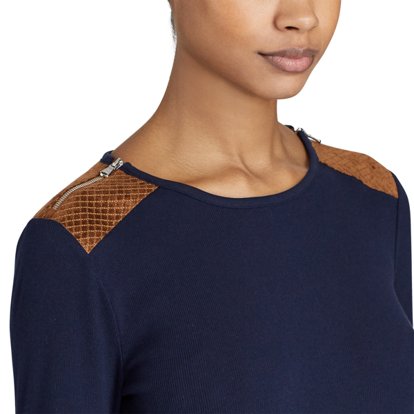 Details Slim fit. Intended to hit at the hip. Size medium has a 26" body length, a 32" bust, a 30" waist, a 28" shoulder, and a 24" sleeve length. Sleeve length changes ½" between sizes. Crewneck. Long sleeves. Faux suede–trimmed zip panel at each shoulder. Shell: 94% cotton, 6% elastane. Panels: 100% polyester. Machine washable. Imported. Model is 5'10"/178 cm and has a 32" bust. She wears a size small.